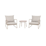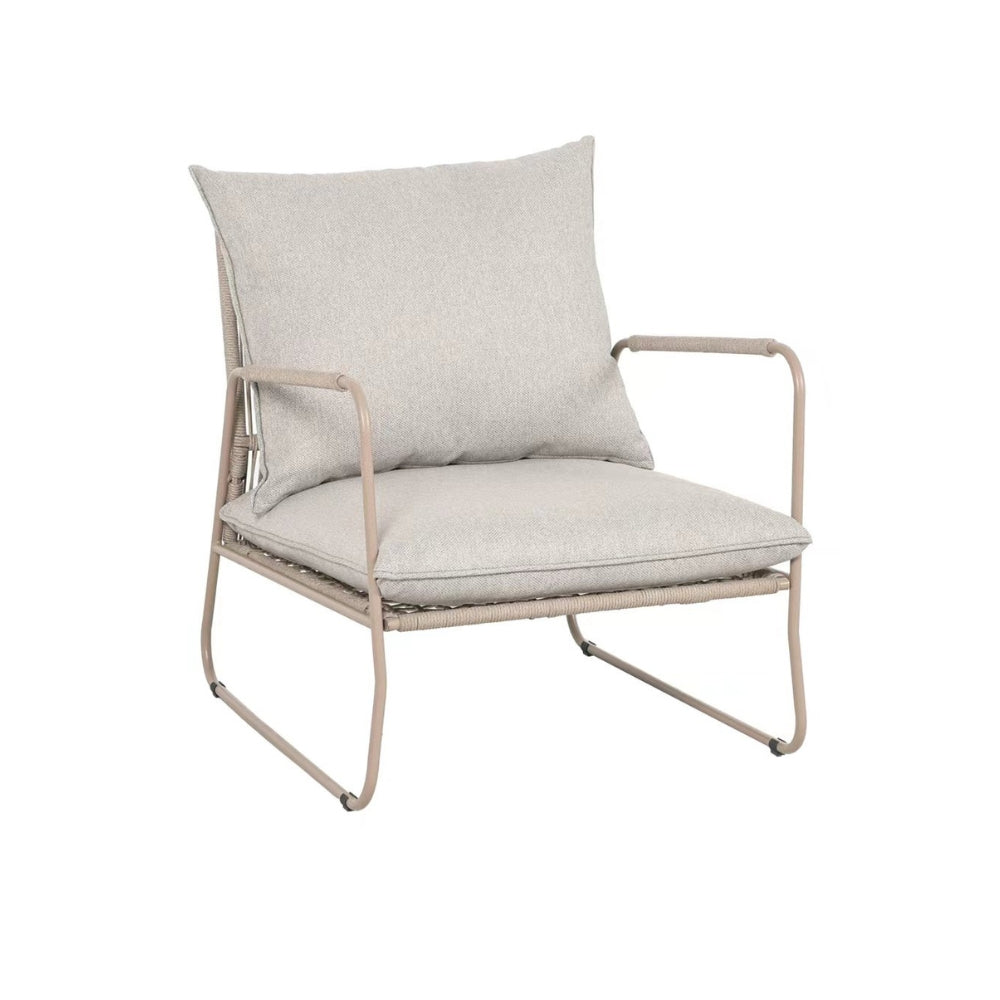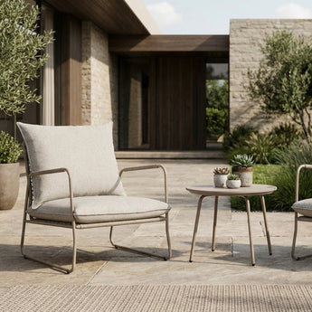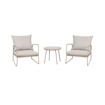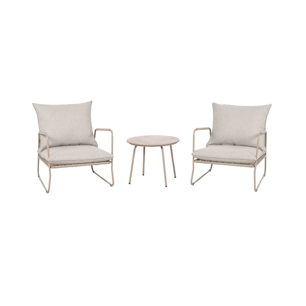 Loungesettet består av to komfortable stoler og et rundt steinbord, perfekt for avslapning på terrassen, balkongen eller i hagen. Med dette loungesettet får du et lett og moderne uttrykk med ramme i aluminium og vakkert vevd tau.