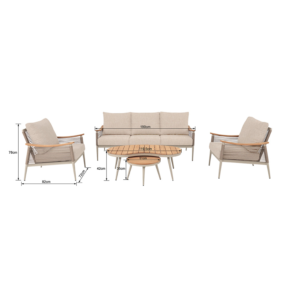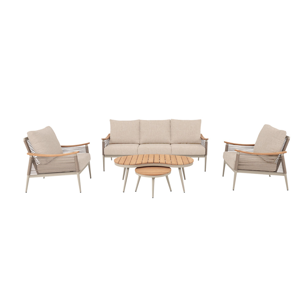 Norvik 5-pers. Loungesæt har et lett og elegant uttrykk med solide materialer som egner seg for utendørs bruk. Loungesettet består av en romslig sofa, to komfortable loungestoler samt to runde bord i forskjellige størrelser.