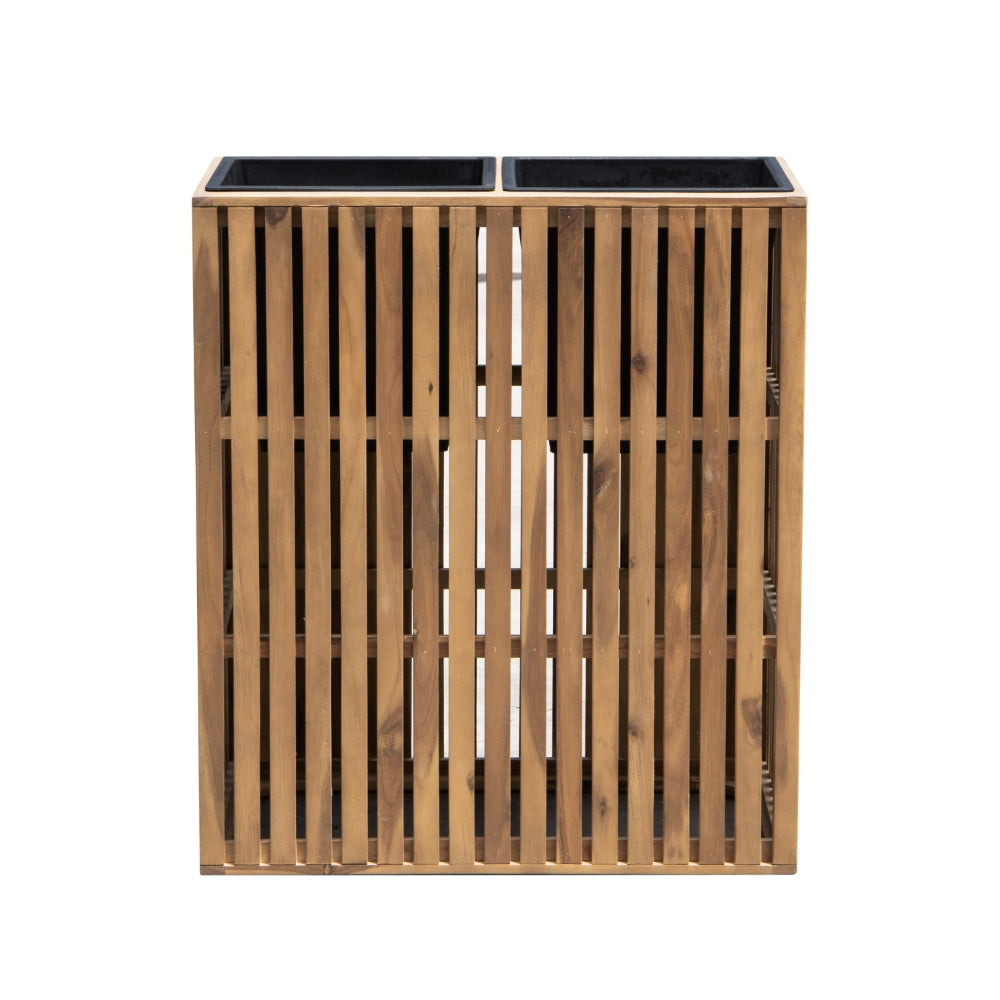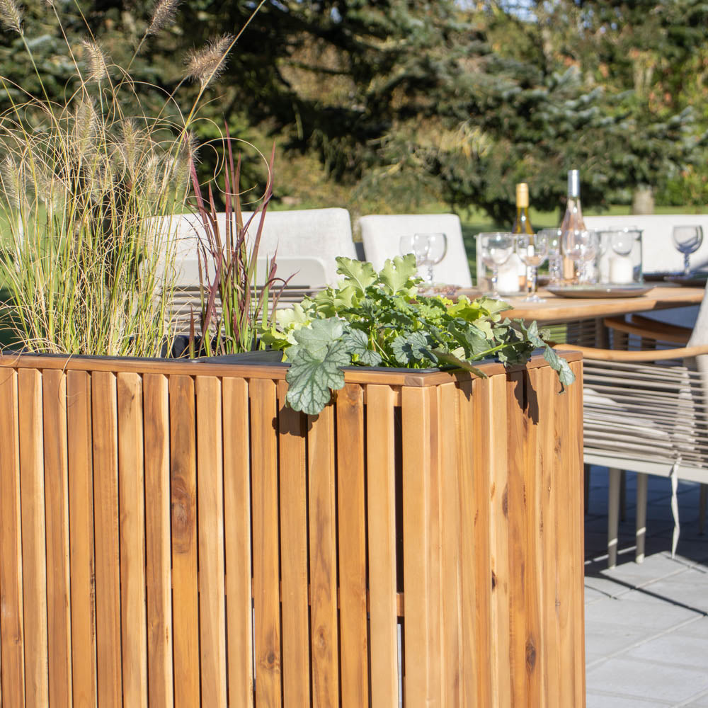 En solid plantekasse i akasietre, som kan brukes både innendørs og utendørs. Den høye modellen gjør den egnet for større planter eller små trær, og den fungerer også godt som avskjerming på terrassen eller balkongen.