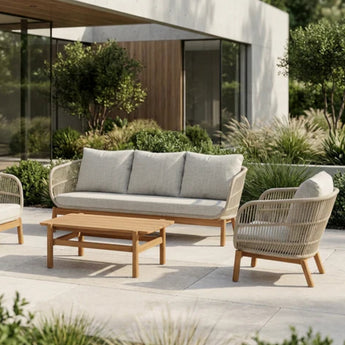 Tokheim 3-pers. loungesofa med beige skipstau er et vakkert tilskudd til hagen, terrassen eller et annet sted der du synes det passer. Treverket på loungesettet er i massivt akasietre, noe som gjør det holdbart. I tillegg er det flettet med beige tau som er UV- og værbestandig. Stoffet på putene er i en fin beige farge. Disse er laget av gjennomfarget polyester, noe som gjør dem slitesterke, vannavvisende og fargeekte. Vi anbefaler alltid at man tar inn putene ved dårlig vær.