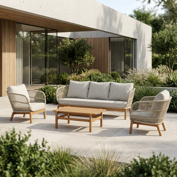 Loungesettet kan brukes både innendørs og utendørs. Hagesettet er laget av skipstau, noe som gjør møbelet ideelt for utendørs bruk, da det er utrolig holdbart.