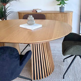 Den runde bordplaten og de vertikale lamellene er en populær kombinasjon, som gir et eksklusivt uttrykk. Spisebordet har en lakkert overflate.