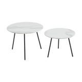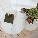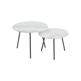 Flot og enkelt sofabordsett, med en flot hvid keramisk plate. Bordene kan brukes på flere forskjellige måter. Bruk dem som sidebord separat, med lampe eller plante for å skape stemning, eller bruk to side om side for et mer fleksibelt salongbord. Høydeforskjellen mellom bordene gjør også at du enkelt kan "dytte" det lave bordet litt under, for mer plass.