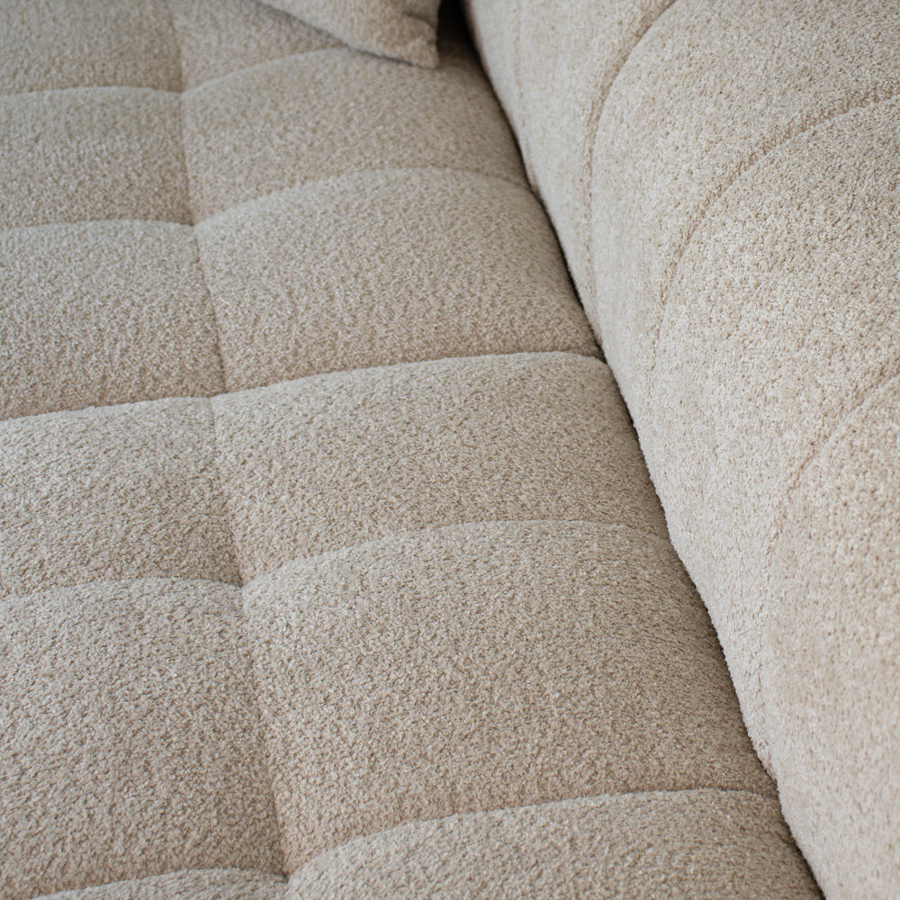 Bora sofaen er en lav og dyp lounge-sofa med ekstra myk komfort - noe som gjør den til den perfekte loungesofaen i hjemmet ditt. Bora Sofaen er polstret i høy kvalitet, med en flott beige bouclé som er litt tykkere, så den føles deilig myk. Sofaen er både slitesterk, enkel å vedlikeholde og en sofa som varer i mange år.