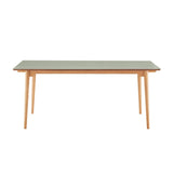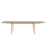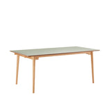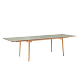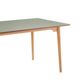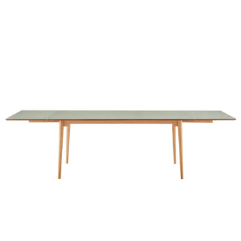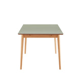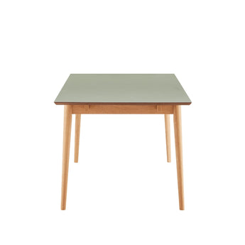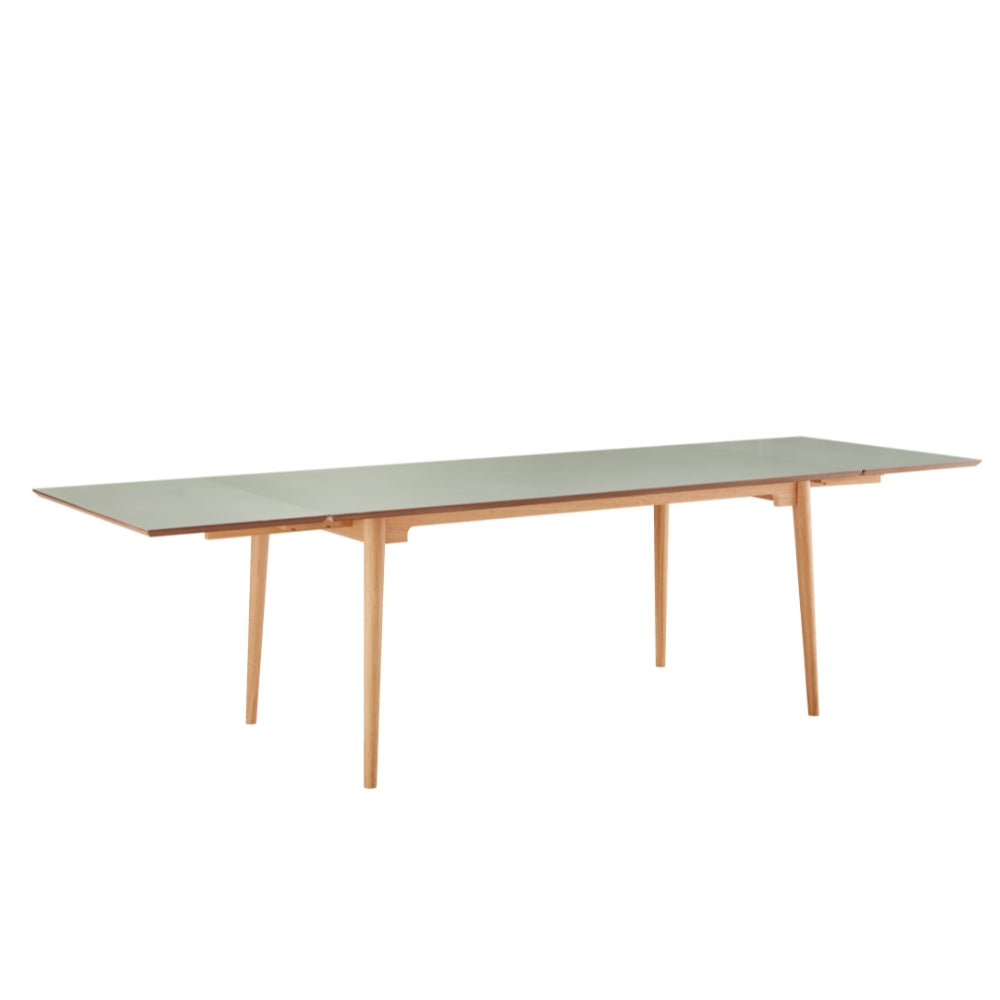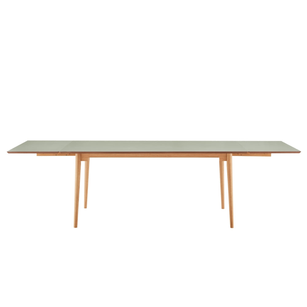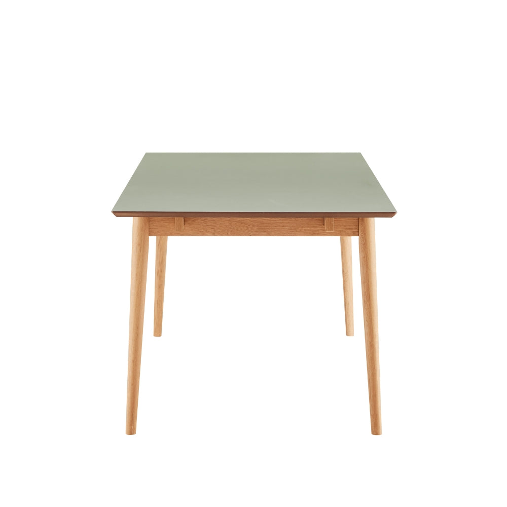 Flott og elegant spisebord med eikeben og en støvet grønn HPL bordplate. Spisebordet gir et eksklusivt uttrykk og tilfører litt farge til hverdagen. Bordet kan forlenges med to tilleggsplater, slik at det er plass til opptil 4 stoler per langside.