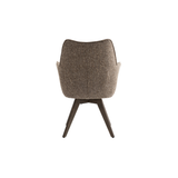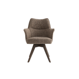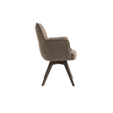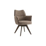Stolen er trukket i et vakkert, melert bouclé-stoff i brun farge, som ikke bare gir stolen et eksklusivt utseende, men også en spennende struktur. Meleringen skaper et fargespill som gjør at den passer inn i både lys og mørkere innredning, samtidig som den gjør den ekstremt praktisk til hverdagsbruk.