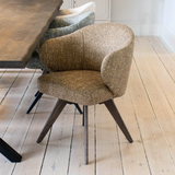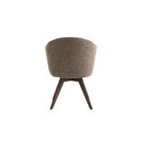 Stolen er trukket i et vakkert, melert bouclé-stoff i en vakker brun farge. Stoffets struktur og fargespill gir stolen litt liv og tekstur. De solide bena i røkt eik skaper en fin kontrast til det brune setet. De slanke bena gir stolen et lett uttrykk, som en kontrast til det romslige setet. Stolen har en svingfunksjon, som gjør det enkelt å komme seg inn og ut av bordet.