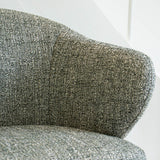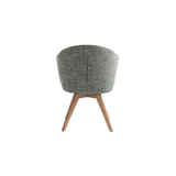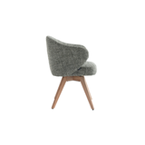 Stolen er trukket i et vakkert, melert bouclé-stoff i en grønn farge. Stoffets struktur og fargespill gir stolen litt liv og tekstur. De lyse natur ben skaper en fin kontrast til det grønne setet. De slanke bena gir stolen et lett uttrykk, som en kontrast til det romslige setet. Stolen har en svingfunksjon, som gjør det enkelt å komme seg inn og ut av bordet.