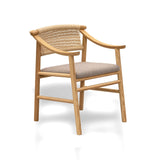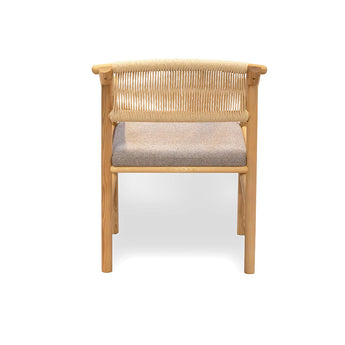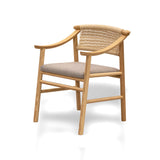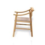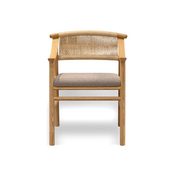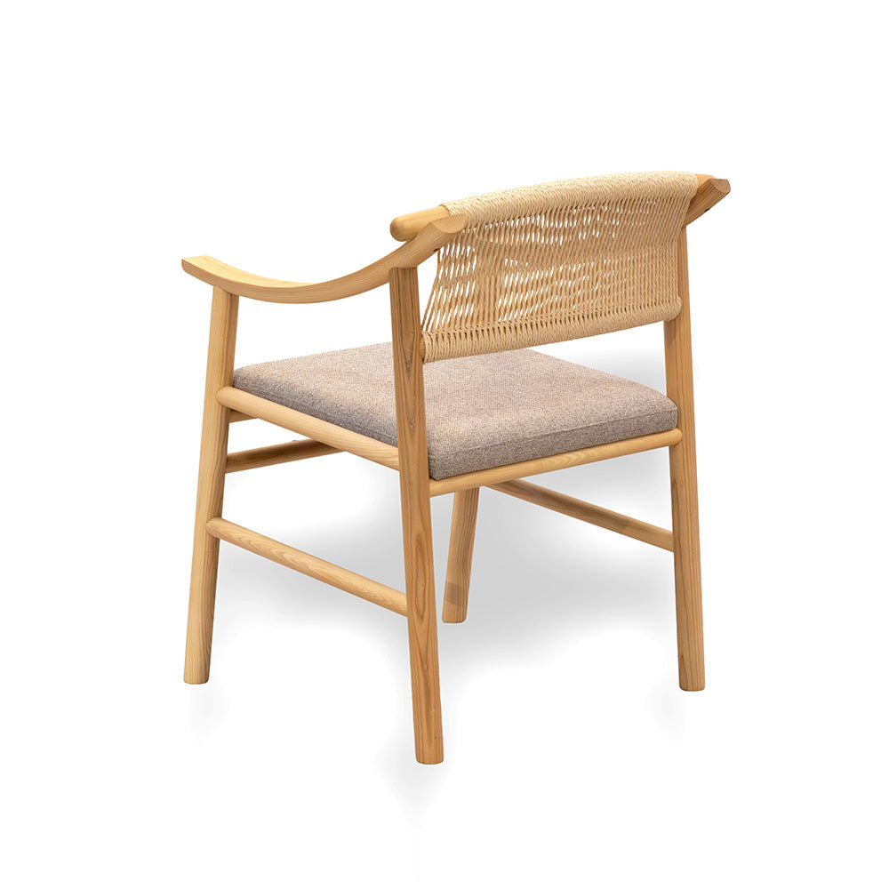 Stolens uttrykk er både annerledes og forlokkende – en kombinasjon av rene linjer og organiske kurver. Armlenene har en særegen, perfekt formet kurve, som føles både vakker og full av karakter, og som gir stolen en sterk visuell identitet. Ryggen er elegant og lett i uttrykket med sin rotting, noe som bidrar til stolens skulpturelle integritet.