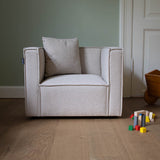 Møblene gir barna et helt eget sted hvor de kan sitte sammen og slappe av, lese en bok eller se en film. Med myke former, robuste materialer og sittehøyde tilpasset små kropper er den både trygg og innbydende.