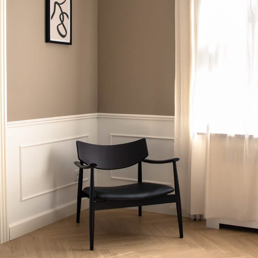 Opplev den perfekte kombinasjonen av stil og komfort med vår eksklusive loungestol i sort lakkert eik. Stolen er designet med rene linjer og naturlige materialer, som er med på å sette prikken over i'en til ethvert rom.