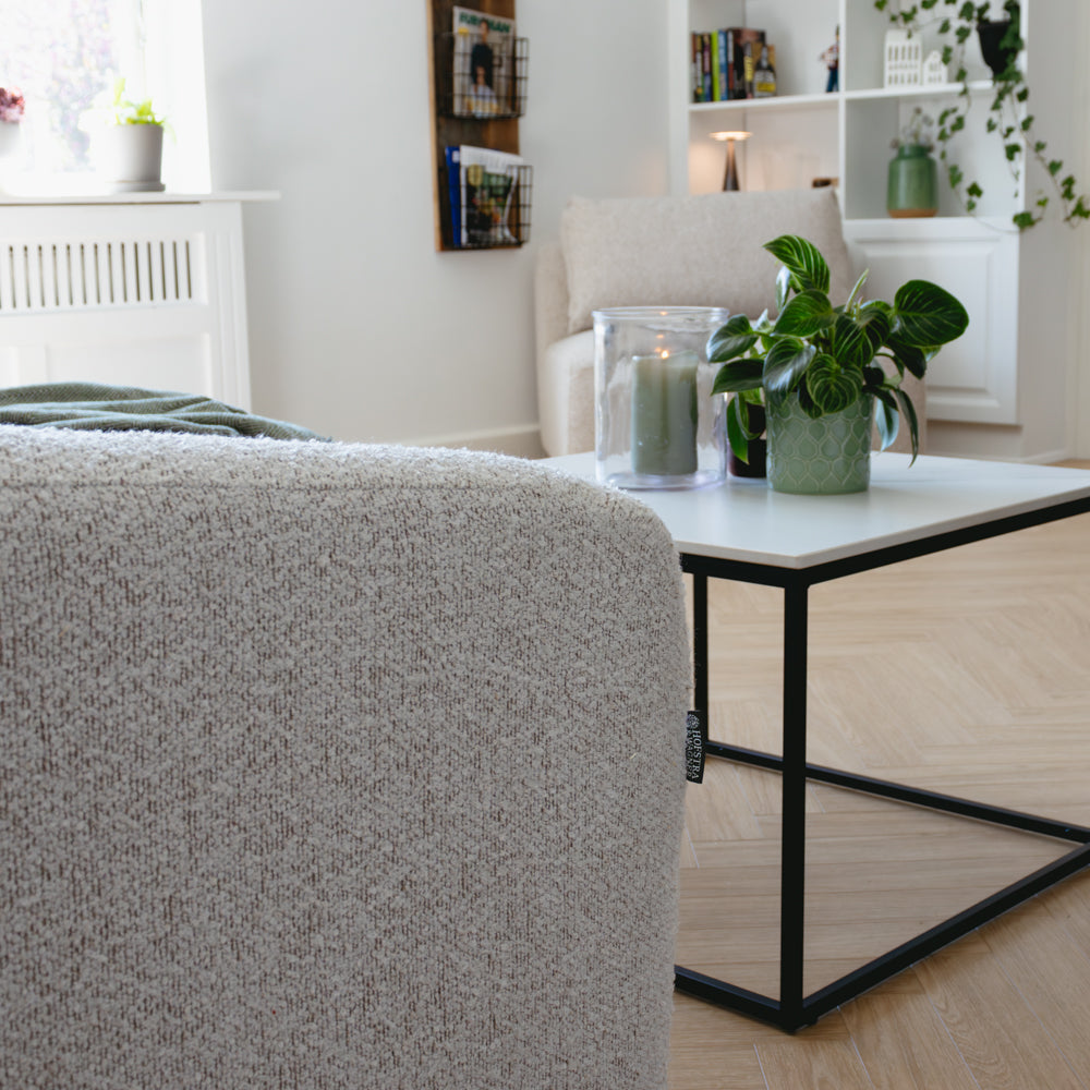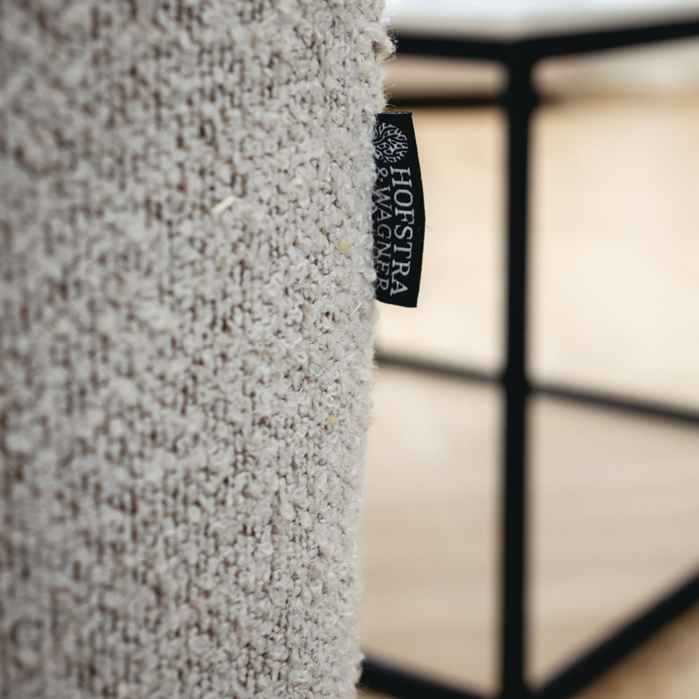 Sofaen er trukket i et slitesterkt og mykt stoff som er behagelig å både sitte og ligge i. Den subtile beige fargen gir interiøret et lyst preg, og harmonerer med både lyse og mørke interiører.