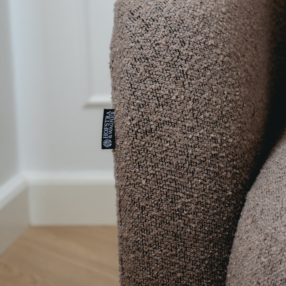 Sofaen er trukket i et slitesterkt og mykt stoff som er behagelig å både sitte og ligge i. Den varme brunfargen tilfører et naturlig element som harmonerer med både lyse og mørke interiører.
