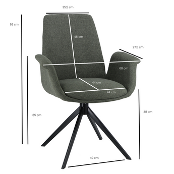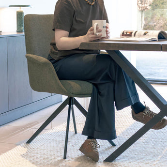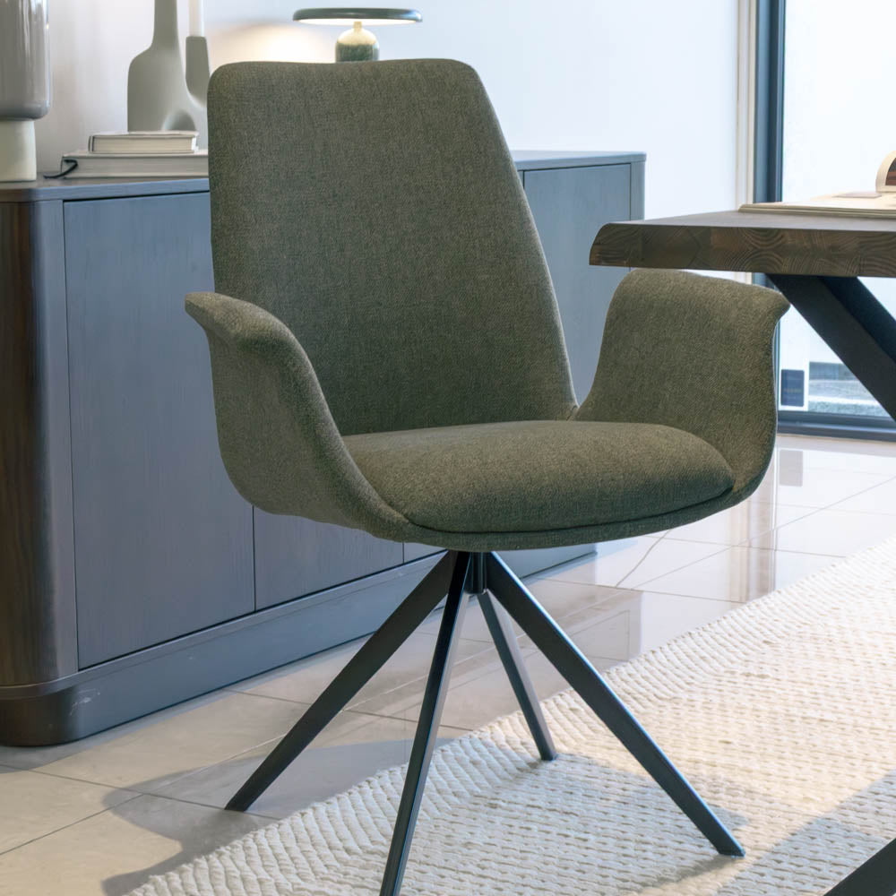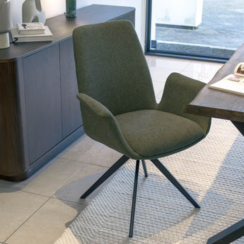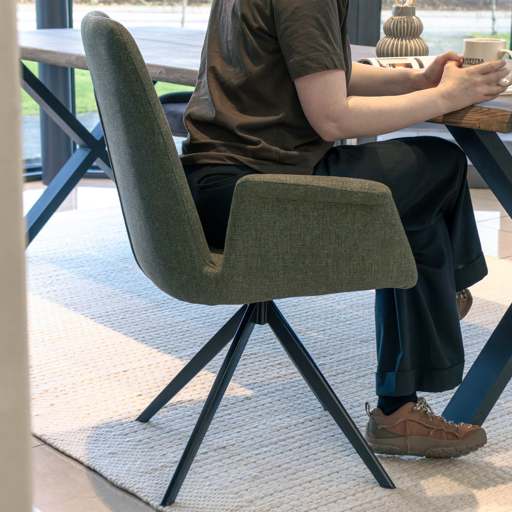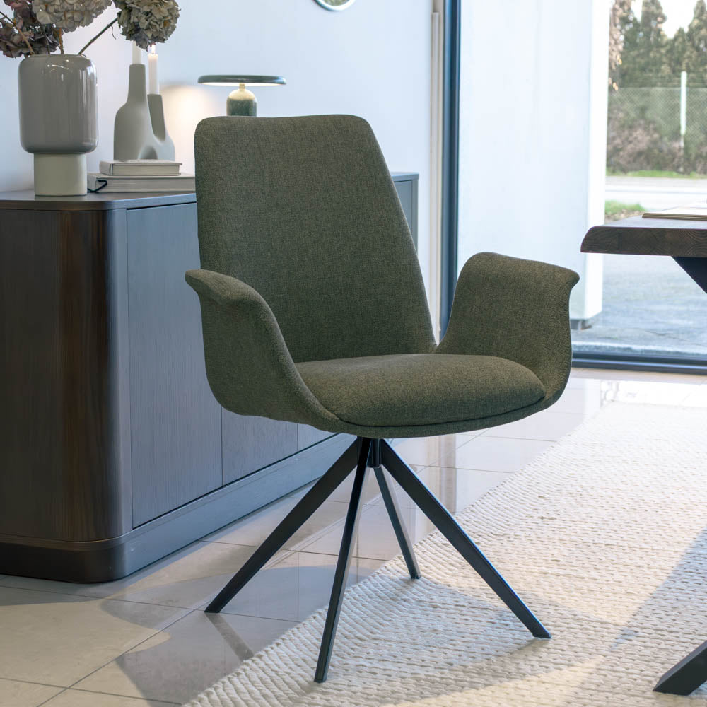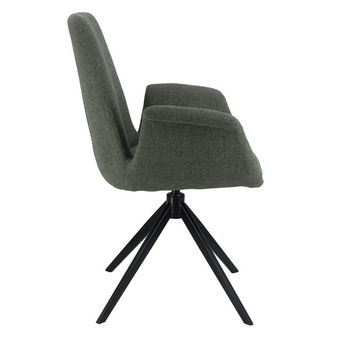 Arvik spisebordsstol er en stilig spisestol med armlener og svingfunksjon. Stolen er i grønn stoff som er slitesterk og har et fint, enkelt utseende.