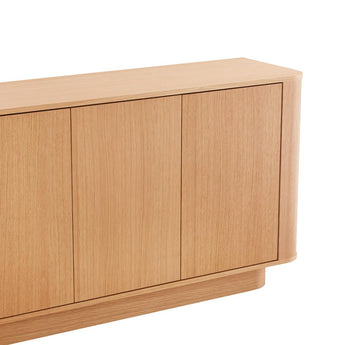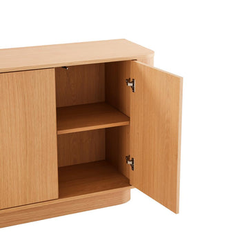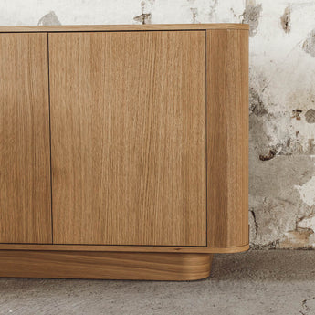 Skjenken har et komplett design med sine myke, runde former som balanserer estetikk og praktisk bruk til perfeksjon. Med sitt svevende uttrykk skaper det et blikkfang for skjenken. Bak de elegante dørene, som åpnes med en lett berøring, kan du vakkert oppbevare alt fra sko, tallerkener, bøker eller noe helt annet.