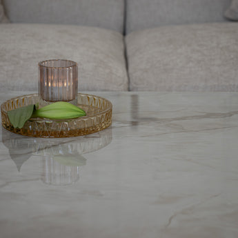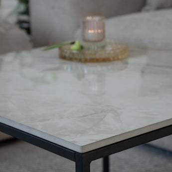Pent og enkelt sidebord med en lekker beige keramisk bordplate. Sidebordene er smarte da de kan brukes på flere forskjellige måter. Bruk dem som sidebord, med lampe eller plante for å skape stemning, eller bruk to ved siden av hverandre for et mer fleksibelt salongbord.