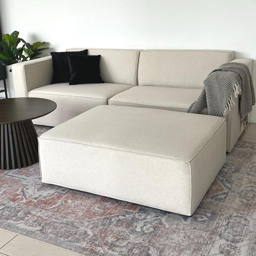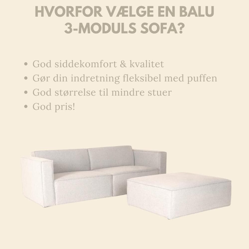 BALU sofaen er vår mest populære sofa-serie, og det kan vi godt forstå! BALU sofaen i lys beige stoff har en ekstrem god fleksibilitet, og finnes i et utvalg av farger. Med en bredde på 230 cm og en puff som kan fungere som en sjeselong, velger du selv hvor den skal plassere puffen. Sofaen har et klassisk look, med flotte syninger og er i en super kvalitet.