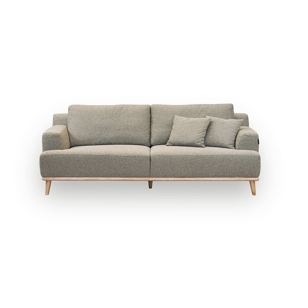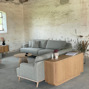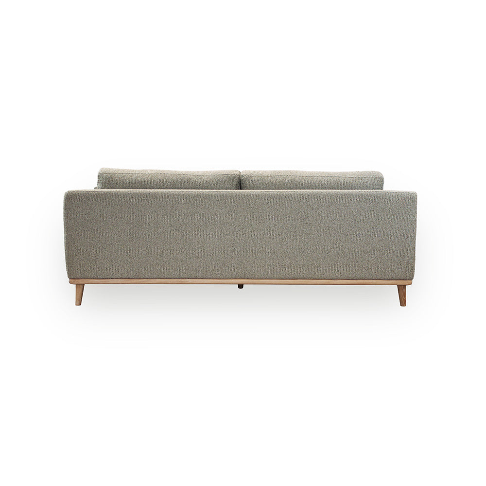 Trerammen med lette ben gir en fin kontrast til trekket, og gir både sofaen og rommet et naturlig og lyst uttrykk.